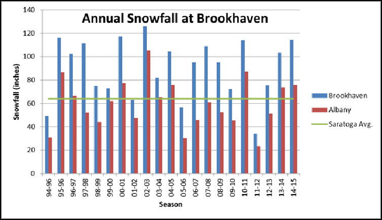 Locals know that the basin just east of the Kayaderosseras Range where Brookhaven is located is a snowy micro climate. Elevation and upsloping give us an average of 90 inches per year, 50% more than Saratoga Springs (64”) or Albany (60”) in the past 20+ years. This allows us to ski into April on most years.